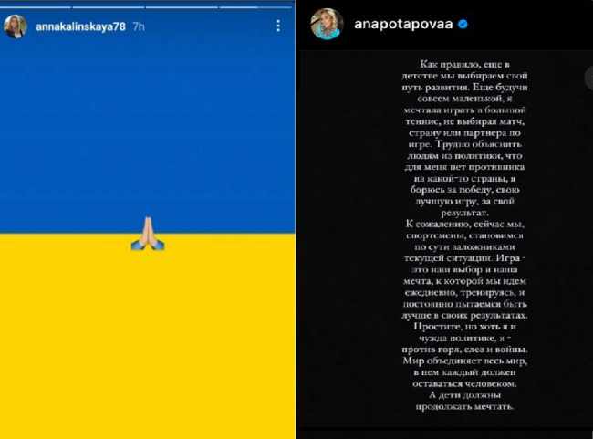 СМИ неизвестно, кто из теннисисток, Анна Калинская или Анастасия Потапова, жаловался судье. Обе теннисистки в начале полномасштабного вторжения России при поддержке Беларуси в Украину опубликовали посты в соцсетях.![]()