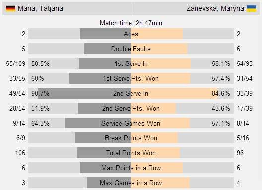 В тяжелом, почти трехчасовом матче 22-летняя одесситка не сумела переиграть пятую ракетку турнира — Татьяну Марию из Германии: 3:6, 6:3, 4:6.