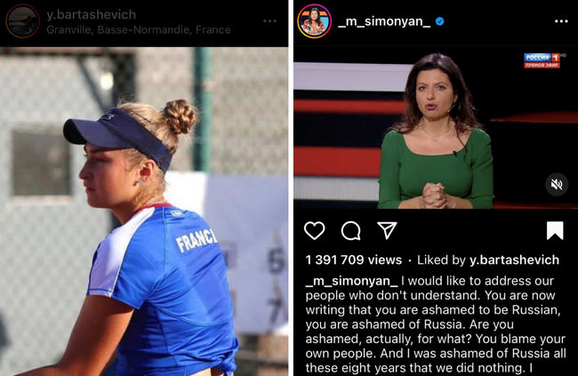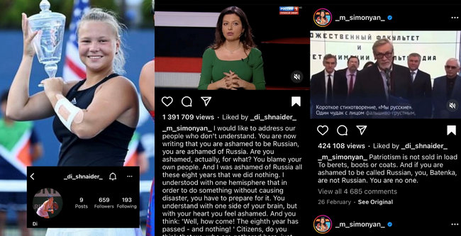 Как вы могли уже понять по вступлению, да, есть представители тенниса, у которых не возникает проблем поставить «сердечко» публикациям о войне, это касается и постов Маргариты Симоньян. Мы не будем полностью перепечатывать эти посты, возьмем только ключевые тезисы, однако оставим их скрины, так что вы сами сможете прочитать или посмотреть столько, сколько пожелаете.