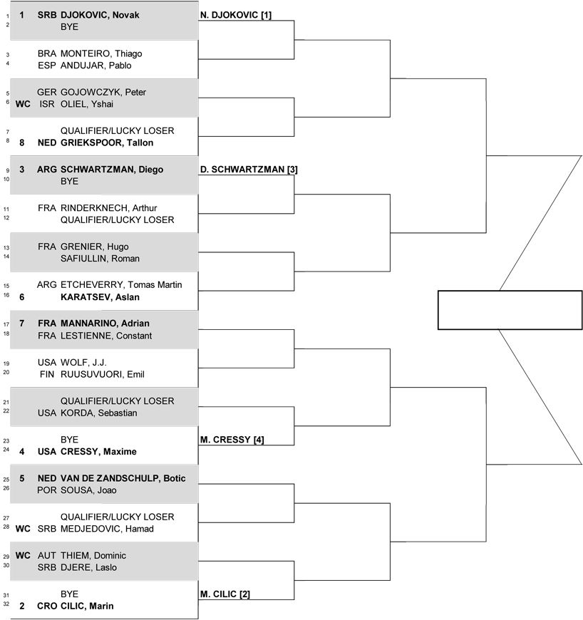 Лидеры посева Новак Джокович (№7 АТР), Марин Чилич (№16 АТР), Диего Шварцман (№17 АТР) и Максим Кресси (№34 АТР) начнут выступления на турнире со второго круга.