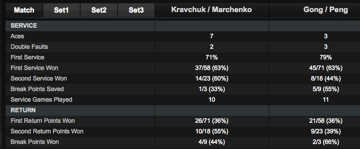 В напряженном поединке, продолжавшемся 1 час 42 минуты Марченко и Кравчук уступили китайско-тайваньской паре Гонг / Пенг 6-3 6-7(10) 10-12. Отметим, что на тайбрейке второго сета Илья и Константин не реализовали три матчбола.