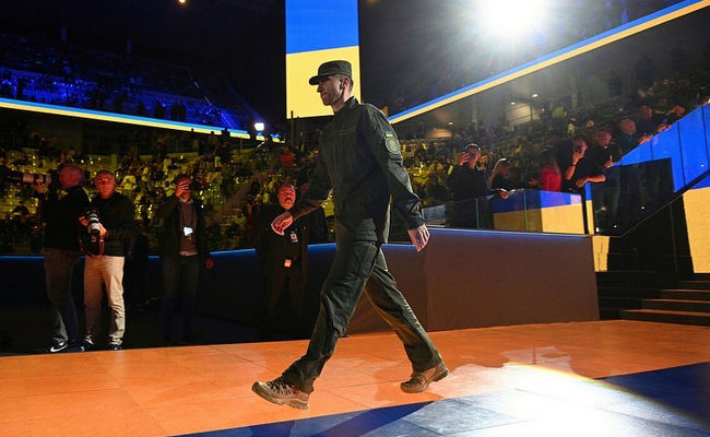 Сергей Стаховский вышел на корт в форме Национальной гвардии Украины, а в момент его выхода все теннисная арена была подсвечена в цвета украинского флага.