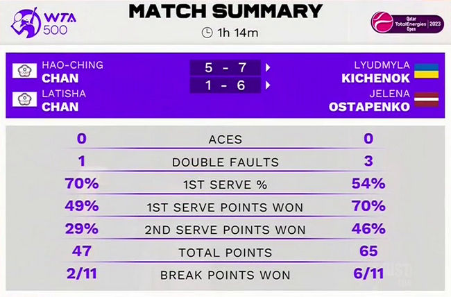 Людмила Киченок/Елена Остапенко (Украина/Латвия, 2) — Чжань Хаоцин/Латиша Чжань (Китайский Тайбэй) 7:5, 6:1