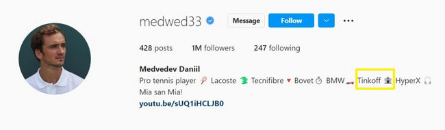 Также в 2019 году коммерческий российский банк «Тинькофф банк» стал сотрудничать с теннисистом Даниилом Медведевым. Еще 22 февраля 2022 года спонсор поддержал теннисиста, который тогда боролся за первую строчку в рейтинге АТР, запустив флешмоб в соцсетях с хэштегом «kiddontstopdreaming» (ребенок, не переставай мечтать). Это отсылка к истории, которую Медведев рассказал после проигрыша в финале Открытого чемпионата Австралии в том же году.