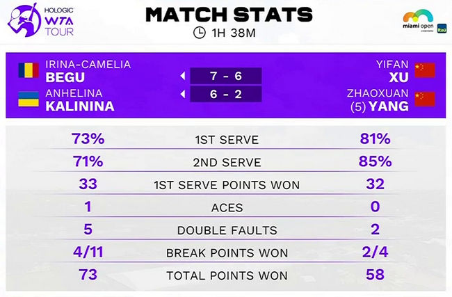 Калинина и Бегу во второй раз играют вместе. В предыдущем сезоне они уступили в первом круге на Уимблдоне. В первом сете теннисистки уступали со счётом 1:4, а на тай-брейке отыграли три сетбола соперниц, проигрывая 3-6.