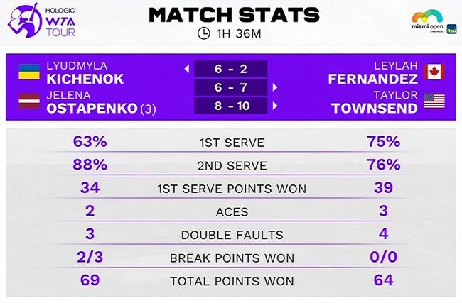 Украинско-латвийский тандем второй раз боролся за выход в полуфинал турнира в Майами, но как и 2021 году, потерпел поражение. Киченок и Остапенко сделали два брейка и не проиграли ни одной своей подачи по ходу встречи. На решающем тай-брейке Киченок и Остапенко уступали 2-7, сумели сократить отставание до минимума, но не смогли взять подачу Фернандес при счете 9:8.