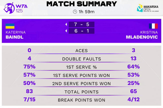 Украинка во второй раз сыграла против Младенович: в 2019 году Байндл проиграла француженке на турнире WTA 250 в Стамбуле. Сегодня в первом сете Катерина совершила камбэк, уступая со счётом 5:2.