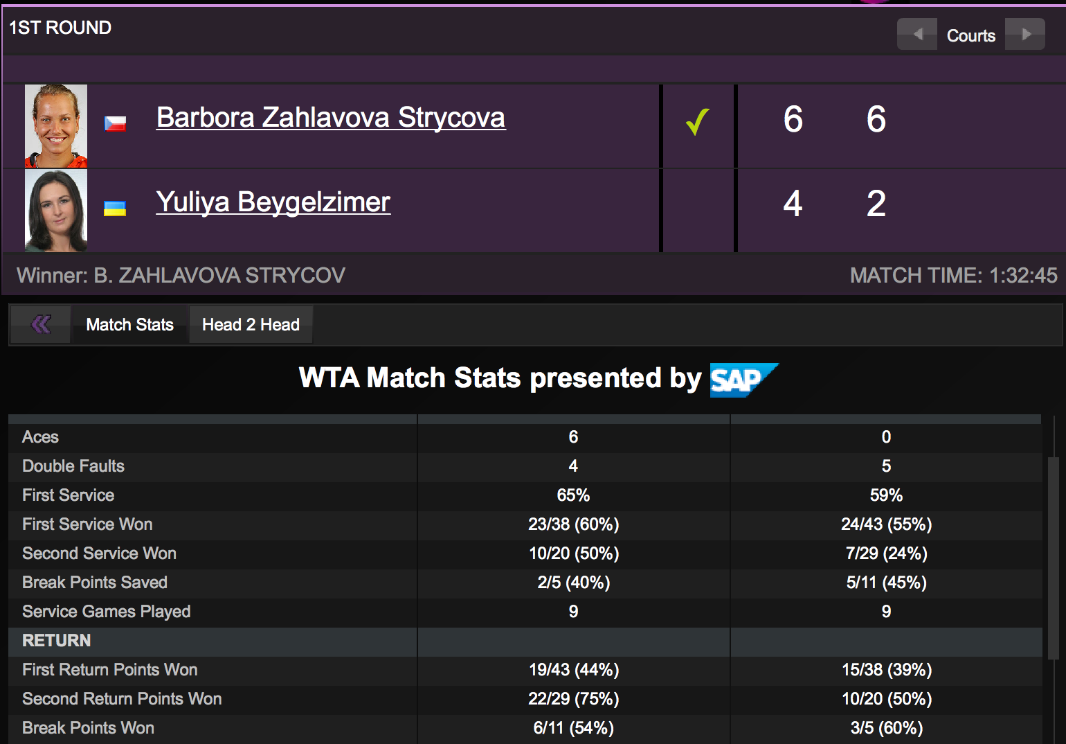 В матче первого круга, украинка уступила со счетом 4-6 2-6, 22-летней чешской теннисистке Барборе Захлавовой-Стрыковой. Поединок продолжался 1 час 32 минуты. Бейгельзимер ни разу не подала навылет, допустила пять двойных ошибок и сделала три брейка.