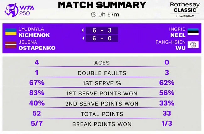 Людмила Киченок/Елена Остапенко (Украина/Латвия, 2) — Ингрид Нил/У Фансень (Эстония/Китайский Тайбэй) 6:3, 6:0