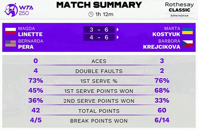 Марта Костюк/Барбора Крейчикова (Украина/Чехия, 2) — Магда Линетт/Бернарда Пера (Польша/США) 6:3, 6:4