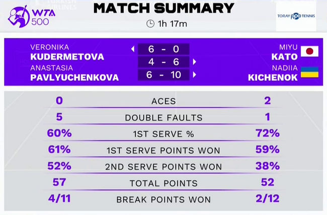 Надежда Киченок/Мию Като (Украина/Япония) — Вероника Кудерметова/Анастасия Павлюченкова (-) 0:6, 6:4, 10-6
