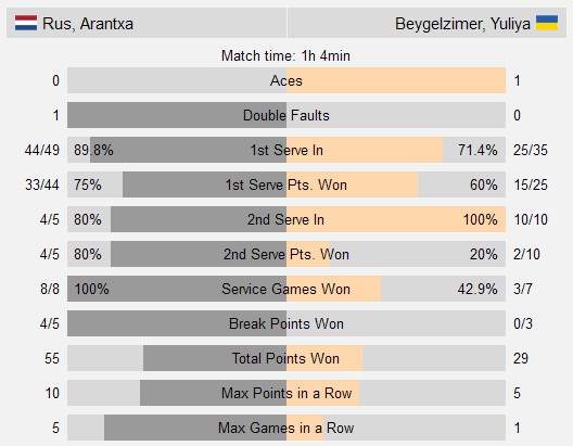 В первом за шесть месяцев профессиональном матче 32-летняя Юлия Бейгельзимер, воспользовавшись «замороженным рейтингом», уступила Аранче Рус из Нидерландов: 1:6, 2:6.
