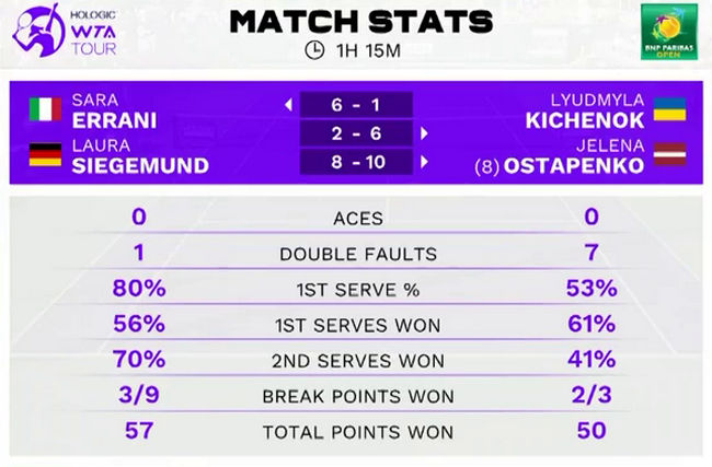 Людмила Киченок/Елена Остапенко (Украина/Латвия, 8) — Сара Эррани/Лаура Зигемунд (Италия/Германия) 1:6, 6:2, 10-8