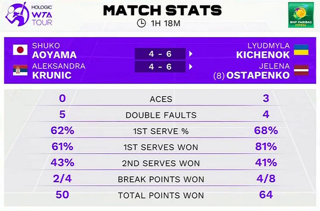 Киченок и Остапенко на пятом из шести сыгранных турниров сыграют в четвертьфинале и будут бороться за четвёртый полуфинал. Напомним, что эта стадия является лучшим результатом теннисисток в Индиан-Уэллс (2021).