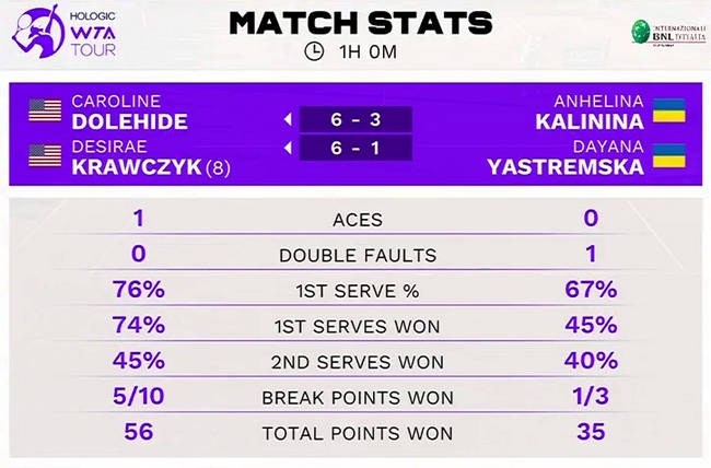 Калинина и Ястремская во второй раз в этом году встретились с представительницами США. В марте украинки обыграли Доулхайд и Кравчик в первом круге турнира WTA 1000 в Майами, где они впервые сыграли вместе.