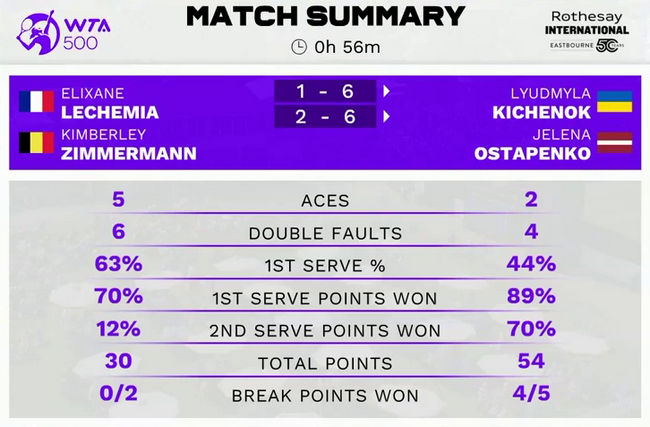 Людмила Киченок/Елена Остапенко (Украина/Латвия) — Эликсан Лешемья/Кимберли Циммерманн (Франция/Бельгия) 6:1, 6:2