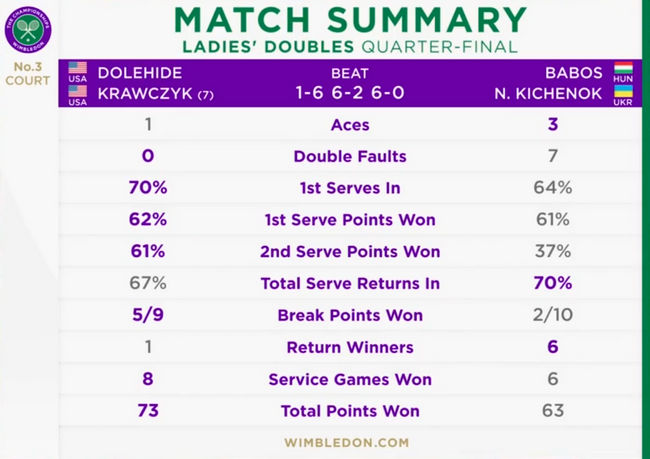 Надежда Киченок/Тимеа Бабош (Украина/Венгрия) — Кэролайн Доулхайд/Дезире Кравчик (США, 7) 6:1, 2:6, 0:6