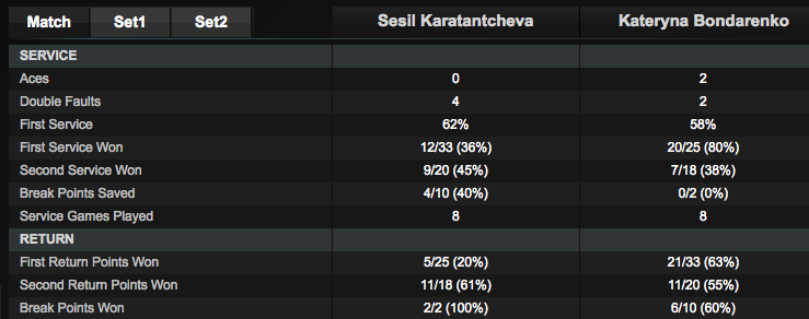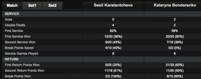 За 53 минуты украинка со счетом 6-2 6-2, разгромила болгарскую теннисистку Сесиль Каратанчеву. Бондаренко, за время матча, дважды подала навылет, столько же раз допустила двойную ошибку и сделала шесть брейков,