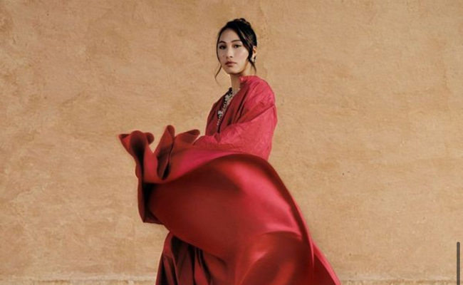 На этой фотосессии у меня было очень красивое платье, оно от Кристиана Диора. Как по мне, оно просто непревзойденное. Я чувствую, что макияж, возможно, я могла бы немного улучшить (смеется). Люди говорят, что я выгляжу на 40 лет. Китайские фанаты так сказали, но я не знаю, почему. Да, возможно, макияж в следующий раз я могла бы сделать лучше (улыбается).