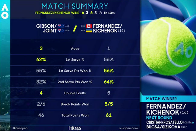 Надежда Киченок/Лейла Фернандес (Украина/Канада, 16) — Талия Гибсон/Майя Джоинт (Австралия, WC) 6:3, 6:3