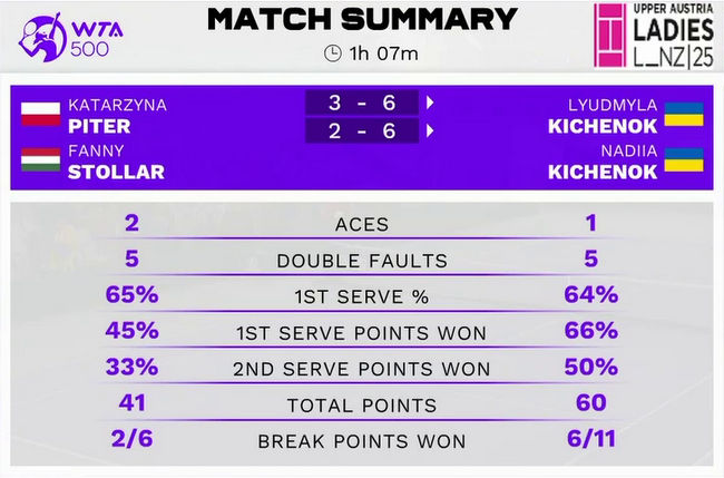 Людмила Киченок/Надежда Киченок (Украина, 3) — Катажина Питер/Фанни Штоллар (Польша/Венгрия) 6:3, 6:2