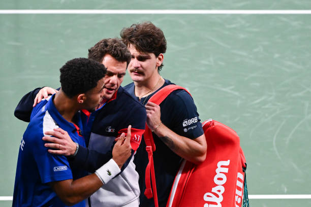 Теннисистов разнял капитан хозяев Поль-Анри Матье. После первого игрового дня Франция уверенно обыгрывает Бразилию, выиграв оба одиночных поединка (ранее Уго Умбер был сильнее Жуана Фонсеки).
