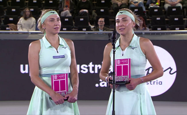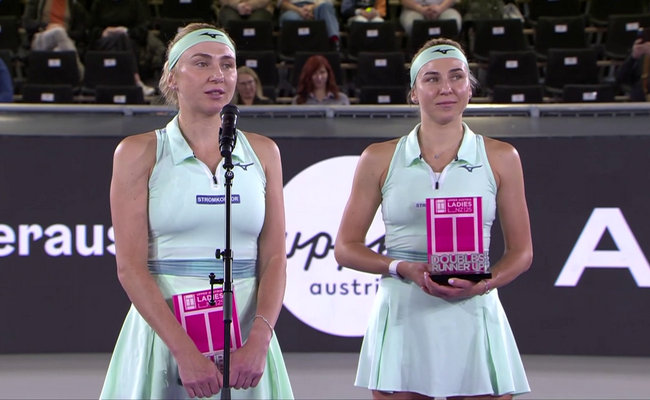 Украинские теннисистки сестры Киченок обратились к болельщикам во время церемонии награждения на соревнованиях в Австрии.