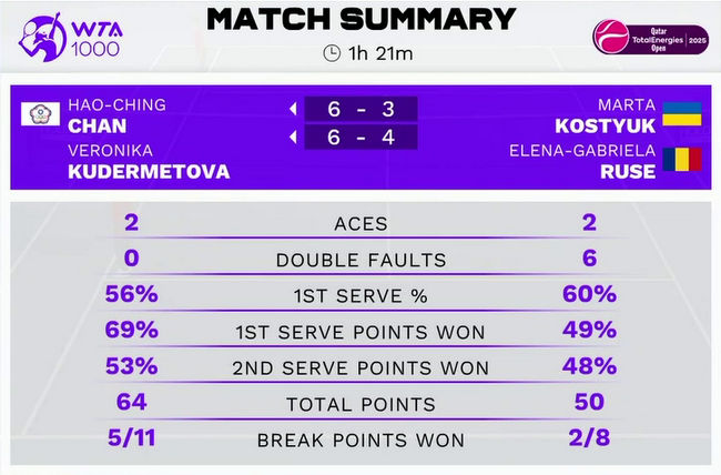Костюк и Русе провели пятый совместный матч в этом сезоне и потерпели второе поражение. По ходу сегодняшней встречи теннисистки реализовали два из восьми брейк-поинтов и проиграли пять геймов на своих подачах.