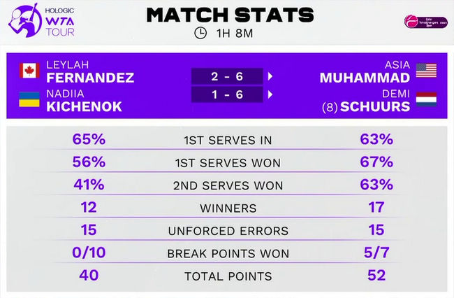 Надежда Киченок/Лейла Фернандес (Украина/Канада) — Эйша Мухаммед/Деми Схюрс (США/Нидерланды, 8) 2:6, 1:6