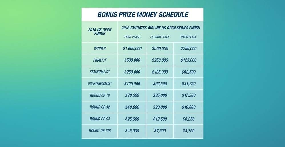 В 2016-м году US Open поднял свой призовой фонд еще на 10% по сравнению с прошлым годом, который составит $46,3 миллиона. Это рекорд по призовым в истории тенниса. В сравнении с US Open на трех других турнирах серии Большого шлема призовые фонды оказались следующими: Australian Open-2016 – $33,5 млн, «Ролан Гаррос» – свыше $35,4 млн, Уимблдон – $37,2 млн. В этом году победители американского «Шлема» получат по $3,5 миллиона. Победителям US Open Series в этом году выпадает возможность заработать $4,5 миллиона долларов по итогам US Open ($1 миллион за серию + $3,5 миллиона за победу на «Шлеме») и попутно установить новый рекорд по призовым.