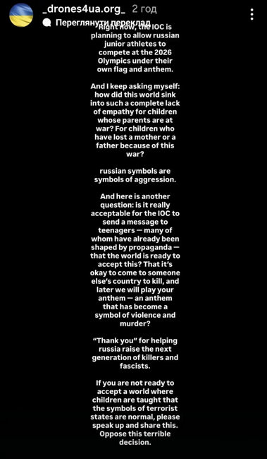 «МОК планирует разрешить российским юниорам соревноваться на Олимпиаде-2026 под своим флагом и с гимном. И я постоянно спрашиваю себя: как этот мир погрузился в такое полное отсутствие эмпатии к детям, чьи родители воюют? К детям, которые потеряли мать или отца из-за этой войны? российские символы — это символы агрессии.