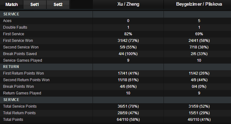 Юлия Бейгельзимер / Кристина Плишкова (Чехия) — И-Фань Сюй / Сай-сай Чжэн (Китай, 1) 5-7 1-6