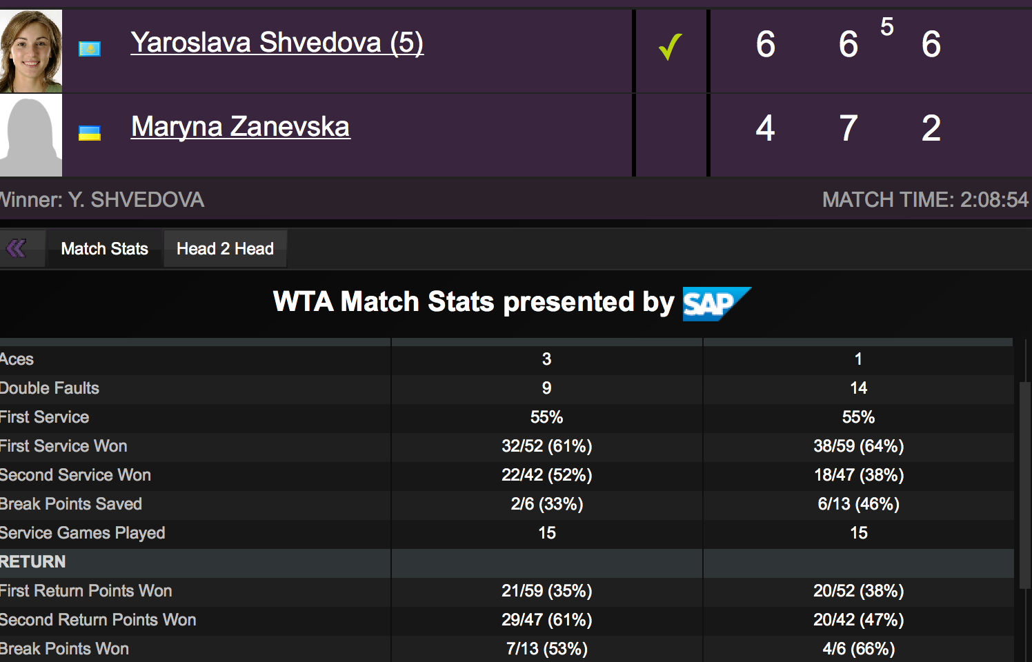 За время поединка, продолжавшегося 2 часа 8 минут, украинка один раз подала навылет, допустила четырнадцать двойных ошибок и сделала четыре брейка на подаче соперницы. Отметим, что в первой партии Марина вела 4-2, но не сумела реализовать свое преимущество.