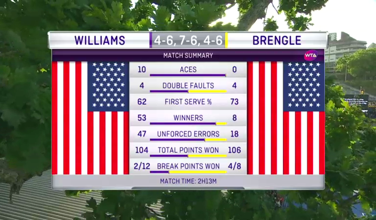 72-я ракетка мира Мэдисон Бренгл стала первой теннисисткой вне Топ-70 за более чем два года, которой удалось обыграть Серену Уильямс. В 2014 году на турнире в Чарльстоне американка уступила Яне Чепеловой из Словакии. Для Бренгл сегодняшняя победа стала третьей над представительницей первой десятки рейтинга WTA.