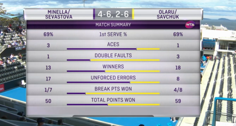 У Мэнди и Анастасии были шансы вернуть потерянный гейм, но украино-румынский дуэт преимущество удерживает. С сетбола сохраняют гейм Минелла и Севастова, а Савчук / Олару не реализовывают первый сетбол уже на своей подаче. С третьей попытки Ольга и Ралука записывают партию в свой актив.