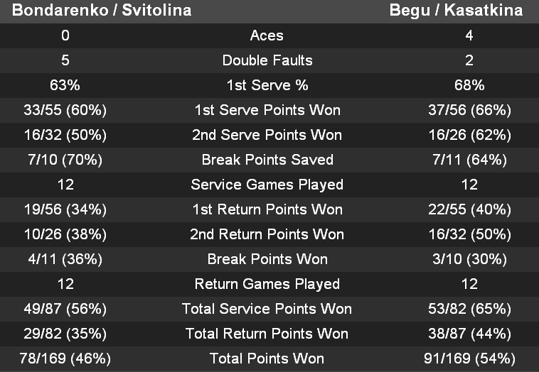 Элина Свитолина / Катерина Бондаренко (Украина) — Ирина-Камелия Бегу (Румыния) / Дарья Касаткина (Россия) 5-7 7-6(3) 6-10