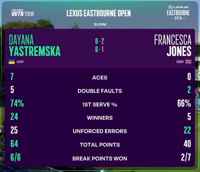 ![]() Lexus Eastbourne Open - WTA 250 Істборн, Велика Британія • 23-28 червня • трава • $275,094 Чинна чемпіонка: Дар'я Касаткіна (Австралія) Сітки турніру: кваліфікація • одиночний розряд • парний розряд Друге коло Даяна Ястремська (Україна, SE) - Франческа Джонс (Велика Британія, WC) 6:2, 6:1 Ястремська вдруге цього року обіграла Джонс. У квітні тенісистки зустрічалися у першому колі турніру WTA 1000 у Мадриді. Українка вперше за три виступи в Істборні вийшла до чвертьфіналу. Цього сезону Даяна вчетверте зіграє на цій стадії змагань і боротиметься за третій півфінал. Нагадаємо, що минулого тижня вона дійшла до фіналу на турнірі WTA 250 у Ноттінгемі. Наступною Ястремською суперницею буде Александра Еала (Філіппіни, Q). Для тенісисток це буде перша зустріч. Обговорення матчу в нашому тенісному чаті у Telegram
