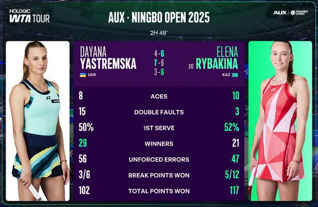Українська тенісистка зазнала третьої поразки у матчах проти Рибакіної в поточному сезоні. У січні Ястремська зустрічалася з казахстанкою на Australian Open, а у серпні - на турнірі WTA 1000 у Монреалі.