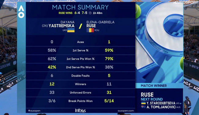 Australian Open. Ястремська поступилася незручній суперниці в матчі першого колаНовини![]() Australian Open - Grand Slam Мельбурн, Австралія • 18 січня - 1 лютого • хард • A$43,436,000 Чинна чемпіонка: Медісон Кіс (США) Сітки турніру: кваліфікація • одиночний розряд Перше коло Даяна Ястремська (Україна) - Єлена-Габріела Русе (Румунія) 4:6, 5:7 Зустріч тривала 1 годину 48 хвилин. У другому сеті Даяна Ястремська поступалася 2:5, але зуміла зрівняти рахунок, відігравши чотири матчболи. Однак далі два гейми поспіль залишилися за Русе. Тенісистки провели четвертий очний поєдинок і вчетверте перемогу здобула румунка. Даяна Ястремська вперше з 2023 року не подолала стартовий раунд в Мельбурні в одиночному розряді. Нагадаємо, що в 2024 році вона встановила національний рекорд, зігравши в півфіналі змагань. Ястремська не залишає Мельбурн, оскільки ще зіграє на АО-2026 в парному розряді, де заявлена разом з американкою Алішею Паркс. За свій виступ в одиночному розряді Даяна Ястремська заробила 150 тисяч австралійських доларів і 10 рейтингових очок. Підписуйтесь на наш Telegram-канал UKRAINIAN TENNIS, щоб не пропустити трансляції матчів за участю українських гравців ![]() |