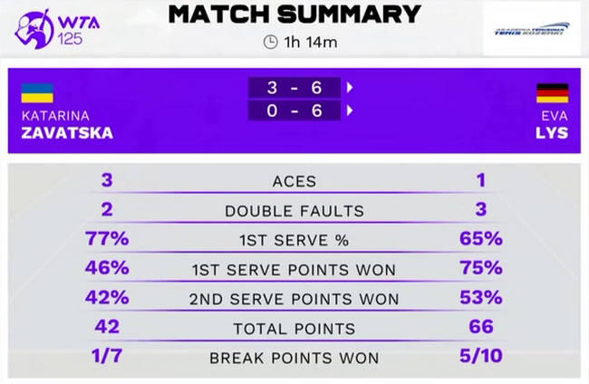 Українська тенісистка зазнала другої поразки від Лис цього сезону. У березні Завацька поступилася представниці Німеччини на старті кваліфікації турніру WTA 1000 в Індіан-Веллс.