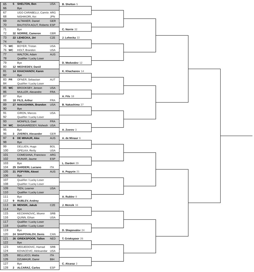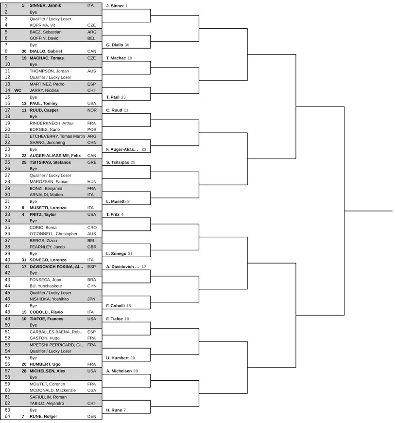 Результати жеребкування турніру ATP 1000 в Цинциннаті![]() Cincinnati Open - ATP Masters 1000 Цинциннаті, США • 7-18 серпня • хард • $10,699,452 Чинний чемпіон: Яннік Сіннер (Італія) Сітка турніру: кваліфікація • одиночний розряд • парний розряд • Турнір у Цинциннаті був заснований у 1899 році і є найстарішим турніром у США, який проводиться в одному і тому ж місті. У цьому сезоні змагання серед чоловіків пройдуть в 124-й раз. З 1979 року матчі турніру граються на відкритих хардових кортах Lindner Family Tennis Center • Ігри основної сітки стартують у четвер 7 серпня. Фінальний матч у парному розряді відбудеться в неділю 17 серпня, в одиночному - в понеділок 18 серпня. • Час турніру: різниця з Києвом становить -7 годин. • Офіційний м'яч турніру - Wilson US Open. • Минулого року чемпіоном турніру став серб Янник Сіннер. Титул у парному розряді виграли Марсело Аревало (Сальвадор) і Мате Павич (Хорватія). • Рекордсменом турніру за кількістю титулів є швейцарець Роджер Федерер, який перемагав на цих кортах 7 разів. • Останнім, кому вдалося захистити свій титул в Цинциннаті, був Роджер Федерер у 2014-2015 роках. • З чемпіонів минулих років у цьому сезоні в Цинциннаті зіграють: Янник Сіннер (2025), Борна Чорич (2022), Александер Звєрєв (2021), Данило Медведєв (2019) і Григор Димитров (2017). Одиночний розряд Wild Card від організаторів отримали: Трістан Бойєр (США) Дженсон Бруксбі (США) Брендон Голт (США) Ніколас Яррі (Чилі) Гравці топ-50, які знялися з турніру: №5 Джек Дрейпер (Велика Британія) №6 Новак Джокович (Сербія) №20 Григор Димитров (Болгарія) №25 Олександр Бублік (Казахстан) №33 Себастьян Корда (США) №37 Губерт Гуркач (Польща) ТОП-8 сіяних та їхні суперники у другому колі (перший раунд пропускають): 1. Янник Сіннер (Італія) - «кваліфаєр» / Віт Копржива (Чехія) 2. Карлос Алькарас (Іспанія) - Маттіа Беллуччі (Італія) / Дамір Джумхур (Боснія і Герцеговина) 3. Олександр Звєрєв (Німеччина) - Гаель Монфіс (Франція) / Нішеш Бассавареді (США) 4. Тейлор Фрітц (США) - Борна Чорич (Хорватія) / Крістофер О'Коннелл (Австралія) 5. Бен Шелтон (США) - Каміло Уго Карабеллі (Аргентина) / Кей Нісікорі (Японія) 6. Алекс де Мінор (Австралія) - Уго Дельєн (Болівія) / Райлі Опелка (США) 7. Хольгер Руне (Данія) - Роман Сафіуллін (-) / Алехандро Табіло (Чилі) 8. Лоренцо Музетті (Італія) - Бенжамен Бонзі (Франція) / Маттео Арнальді (Італія) Очки та призові: R1: 10 очок / $23,760 R2: 30 очок / $35,260 R3: 50 очок / $60,400 R4: 100 очок / $103,225 QF: 200 очок / $189,075 SF: 400 очок / $332,160 FR: 650 очок / $597,890 W: 1000 очок / $1,124,380 ![]() ![]() Парний розряд *очікується |