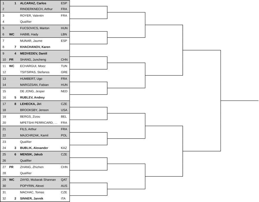 Результати жеребкування на турнірі ATP 500 у Катарі![]() Qatar ExxonMobil Open - ATP 500 Доха, Катар • 16-21 лютого • хард • $2,833,335 Чинний чемпіон: Андрій Рубльов (-) Сітки турніру: кваліфікація • одиночний розряд • парний розряд • Катарський турнір ExxonMobil Open, один із двох турнірів ATP-туру, що проводяться на Близькому Сході. Уперше був проведений 1993 року, а цього сезону відбудеться вже 34-й розіграш турніру. Минулого року змагання було підвищено до категорії АТР 500. • Матчі Qatar Open проходять на відкритих хардових кортах Khalifa International Tennis and Squash Complex. • Гравці п'ять разів визнавали ці змагання найкращим турніром року за версією ATP у категорії 250 (2015, 2017, 2019, 2021-22). • Офіційний м'яч турніру - Dunlop АТР. • Час турніру: різниця з Києвом становить +1 годину. • Ігри основної сітки стартують у понеділок 16 лютого. Фінальні матчі в одиночному і парному розрядах відбудуться в суботу - 21 лютого. • Минулого року одиночний титул у Досі виграв Андрій Рубльов. Парний титул виграли британці Джуліан Кеш і Ллойд Гласспул. • Рекордсменом турніру за кількістю титулів є швейцарець Роджер Федерер, який перемагав у Досі тричі (2005, 2006, 2011), • Із чемпіонів минулих років цього сезону в Досі виступлять: Андрій Рубльов (2020, 2025), Карен Хачанов (2024) і Данило Медведєв (2023). Одиночний розряд Wild Сard від організаторів отримали: Моес Ешаргі (Туніс) Хаді Хабіб (Ліван) Мубарак Шаннан Заїд (Катар) ТОП-8 сіяних і їхні перші суперники 1. Карлос Алькарас (Іспанія) - Артур Ріндернеш (Франція) 2. Яннік Сіннер (Італія) - Томаш Махач (Чехія) 3. Олександр Бублик (Казахстан) - «кваліфаєр» 4. Данило Медведєв (-) - Шан Цзюньчен (Китай) 5. Андрій Рубльов (-) - Єспер де Йонг (Нідерланди) 6. Якуб Меншик (Чехія) - «кваліфаєр» 7. Карен Хачанов (-) - Жауме Мунар (Іспанія) 8. Їржі Легечка (Чехія) - Дженсон Бруксбі (США) Очки та призові: R1: 0 очок / $22,095 R2: 50 очок / $41,435 QF: 100 очок / $77,625 SF: 200 очок / $151,935 FR: 330 очок / $285,095 W: 500 очок / $529,945 ![]() Парний розряд Wild Сard від організаторів отримали: Моес Ешаргі/Мубарак Шаннан Заїд (Туніс/Катар) Реда Беннані/Пабло Карреньйо Буста (Марокко/Іспанія) ТОП-4 сіяних та їхні суперники: 1. Джуліан Кеш/Ллойд Гласспул (Велика Британія) - Уго Умбер/Артур Ріндеркнеш (Франція) 2. Марсело Аревало/Мате Павич (Сальвадор/Хорватія) - Олександр Бублик/Шан Цзюньчен (Кахастан/Китай) 3. Гаррі Геліеваара/Генрі Паттен (Фінляндія/Велика Британія) - Карен Хачанов/Андрій Рубльов (-) 4. Франсішку Кабрал/Лукас Мідлер (Португалія/Австрія) - Сандер Арендс/Роман Арнеодо (Нідерланди/Монако) Очки та призові: R1: 0 очок / $12,150 QF: 90 очок / $23,490 SF: 180 очок / $46,960 FR: 300 очок / $92,820 W: 500 очок / $174,050
