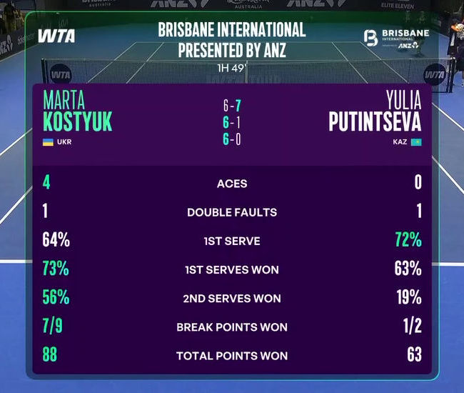 Брісбен. Костюк здобула вольову перемогу над Путінцевою, оформивши "бублик" у вирішальному сетіНовини