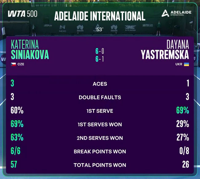Новини![]() Adelaide International - WTA 500 Аделаїда, Австралія • 12-17 січня • хард • $1,206,446 Чинна чемпіонка: Медісон Кіс (США) Сітки турніру: кваліфікація • одиночний розряд • парний розряд Перше коло Даяна Ястремська (Україна) - Катержина Синякова (Чехія, LL) 0:6, 1:6 Українка провела на корті менше години ігрового часу. Протягом матчу Ястремська не реалізувала жодного з восьми брейк-поїнтів та програла шість геймів на своїй подачі. Наступним турніром для тенісистки буде Australian Open, який розпочнеться найближчої неділі. Підписуйтесь на наш Telegram-канал UKRAINIAN TENNIS, щоб не пропустити трансляції матчів за участю українських гравців