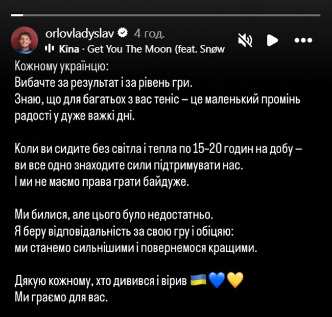 Владислав Орлов звернувся до українських уболівальників після матчу збірної у командному турнірі"Ми не маємо права грати байдуже". Гравець збірної України вибачився за поразку в матчі Кубка Девіса проти Люксембургу![]() Нагадаємо, що минулого тижня збірна України програла Люксембургу з рахунком 1-3 у Плей-оф Першої Світової групи. Владислав Орлов поступився в поєдинку проти другого номера Люксембургу Алекса Кнаффа, а на наступний день, разом з Олександром Овчаренком зазнав поразки в парному поєдинку. "Кожному українцю: Вибачте за результат і за рівень гри. Знаю, що для багатьох з вас теніс - це маленький промінь радості у дуже важкі дні. Коли ви сидите без світла і тепла по 15-20 годин на добу - ви все одно знаходите сили підтримувати нас. І ми не маємо права грати байдуже. Ми билися, але цього було недостатньо. Я беру відповідальність за свою гру і обіцяю: ми станемо сильнішими і повернемося кращими. Дякую кожному, хто дивився і вірив. Ми граємо для вас". У вересні збірна України зіграє у Другій Світовій групі за право знову вийти до етапу Плей-оф.
